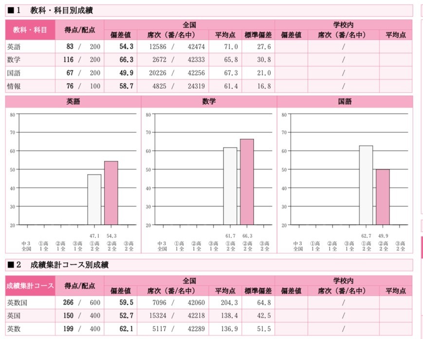 この時期に受けてみた模試の結果です。部活引退をして模試を受けることで、全体の受験生の中での自分の立ち位置が知れ、役立ちました。