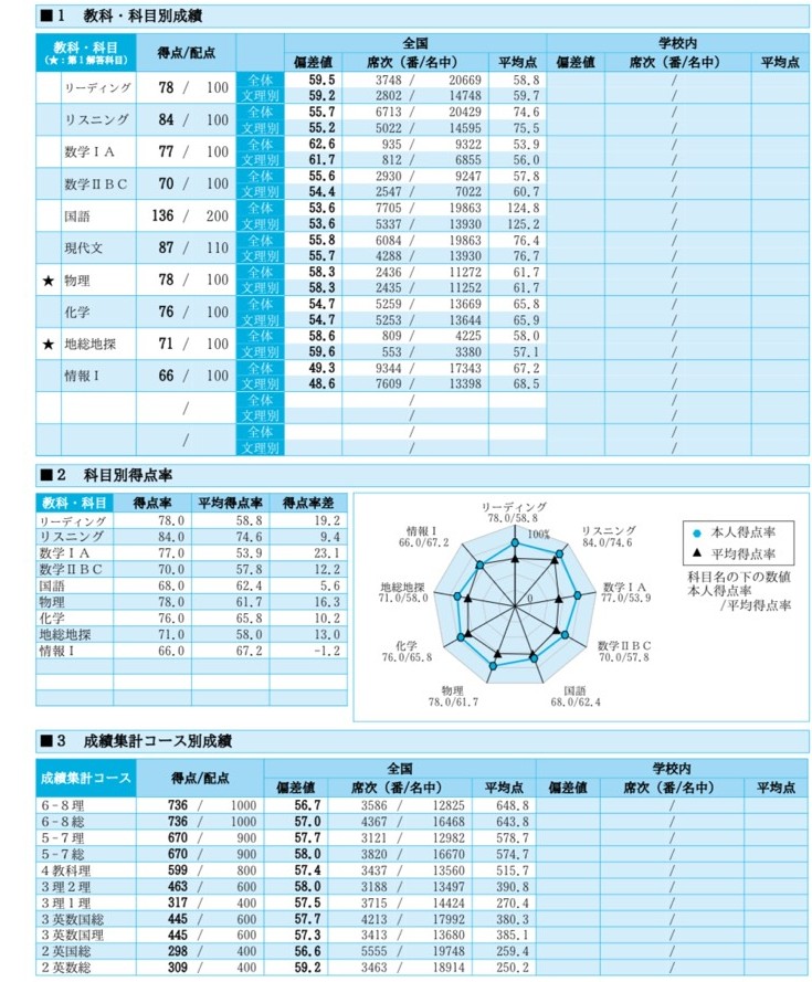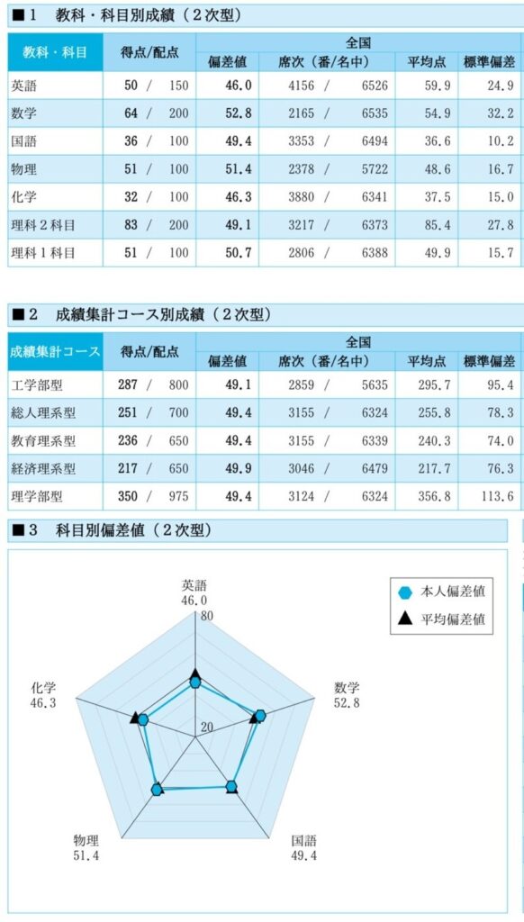 その一方で共通テストに時間を割いている間は、本番が近づいてくる焦燥感や二次試験対策が疎かになっていることへの不安感が募ります。そんな時こそ、自分の成績と照らし合わせてやってることが正しいと信じてください。